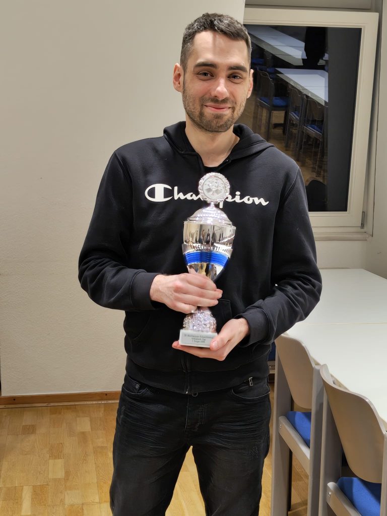 Für das sportliche Highlight des Turniers sorgte jedoch Kevin: Als Nummer 43 von 51 Teilnehmern gestartet, erspielte er sich beeindruckende 4 Punkte. Besonders dabei gegen Gegner, die im Schnitt rund 200 DWZ-Punkte stärker waren. Da gleich fünf Spieler auf 4 Punkte kamen, musste die Buchholz-Wertung entscheiden. Hier hatte Kevin knapp die Nase vorn und sicherte sich sensationell den Turniersieg in der C-Gruppe.